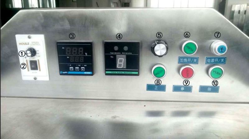 那么,这些开关按纽分别都有什么作用呢? ①、调速器旋钮(正面白色):用于调节炒锅转速,顺时针调节加速,逆时针调节减速,可根据炒制品特性,适当调整。 ②、调速器开关(正面黑色):调速器的电源开关,按下此开关上端,调速器通电,按下此开关下端,调速器断电,(注:调速器断电时,炒锅不转动) ③、温控器(正面黑色):PV显示炒锅内的实时温度,SV显示预设定的需求温度。按一下左下角的键可设置需求温度,向上向下按键可以对数值进行增加或减少,设置好后,再按一下左下角的键确认并退出设置。当PV值低于SV值时,正常加热;当PV值等于SV值时,自动停止加热并报警;当PV值再次低于SV值时,自动开始加热,就这样循环加热,达到恒温目的。 ④、加热档位显示器(正面黑色):显示加热的档位,可依次分别显示“一”、“1”、“2”、“3”、“4”、“5”,显示“一”时不加热,档位越高,功率越大,加热越快。 ⑤、加热档位调节旋钮(正面白色):用于调节加热档位,顺时针调节加大档位,逆时针调节减小档位。 ⑥、“加热开/关”(正面绿色):炒货机加热开关按钮,按一下灯亮时开始加热,再按一下灯灭时停止加热。炒货前一般需要先预加热。 ⑦、“电源开/关”(正面蓝色):炒货机电源总开关,锁孔垂直时为关机状态,锁孔水平时为开机状态。 ⑧、“正”(正面绿色):炒锅顺时针转动按钮,按下 此按钮,指示灯亮,炒锅顺时针转动。此时可以上料开始炒货。 ⑨、“停”(正面红色):停止炒货按钮。出货前,应先按下此按钮,指示灯亮,炒锅停止转动。 ⑩、“倒”(正面绿色):炒锅逆时针转动按钮,按下此按钮,指示灯亮,炒锅逆时针转动,此时可自动出料,炒货结束。